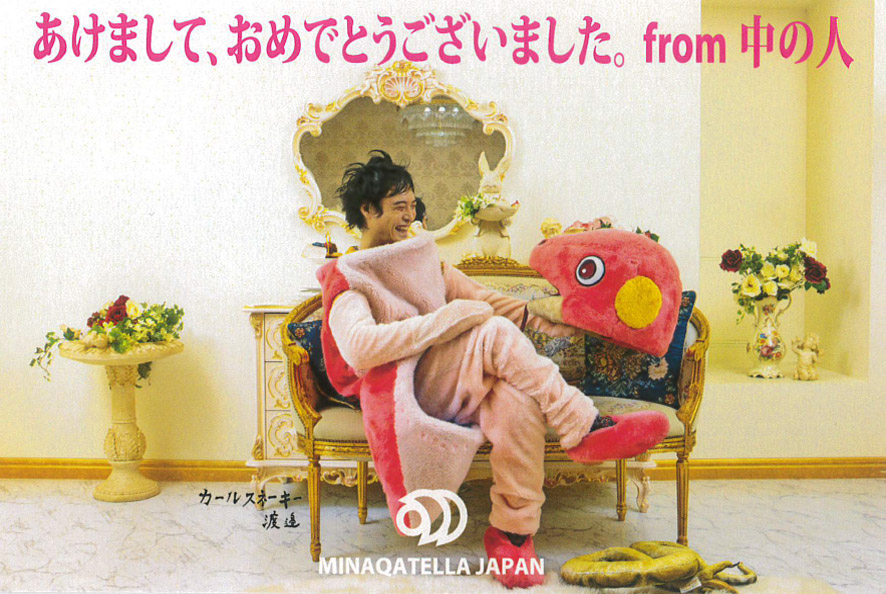 2013 年賀状 「巳ナカテーラ姫&カールスネーキー」 2013年、へび年。手足が組み込まれ、もはやへびとは呼べないユルい着ぐるみをフィーチャーし、謎の貴族とそのペットへびのコンビ写真の年賀状をお送りしました。 「その着ぐるみ、予約できる日はありますか?」「えーと、予約が入っている日がございません。」 元旦から時間差で中の人Verも送りつける形で存在をアピールしました。