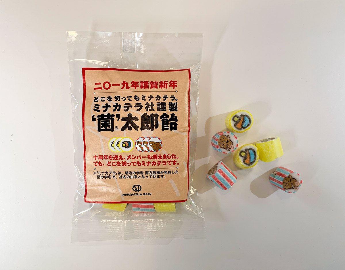 人が増えても会社のカラーをだいじにしようという結束の意味も込め、「どこを切ってもミナカテラ」をテーマに金太郎飴(ミナカテラは菌の名前なので'菌太郎飴')を制作しました。制作は金太郎飴の元祖、金太郎飴本店。