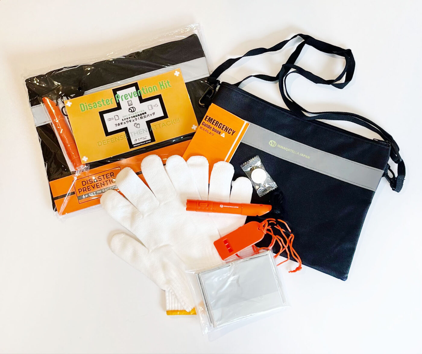 2021 2021年、守りは攻めである。 「7点ギュウギュウ!防災バッグ」 2020年に続き2021年も我慢の年。「守りは攻めである」という考えからお年賀は防災バッグに。アルミシート、ホイッスル、圧縮タオル、軍手、ペン&ライト、防災のしおり、そしてそれらが全部入るロゴ入りサコッシュのセットです。ミナカテラ ジャパンが少しでも皆さまの安全のお役にたてますよう の願いをこめたアイテムです。